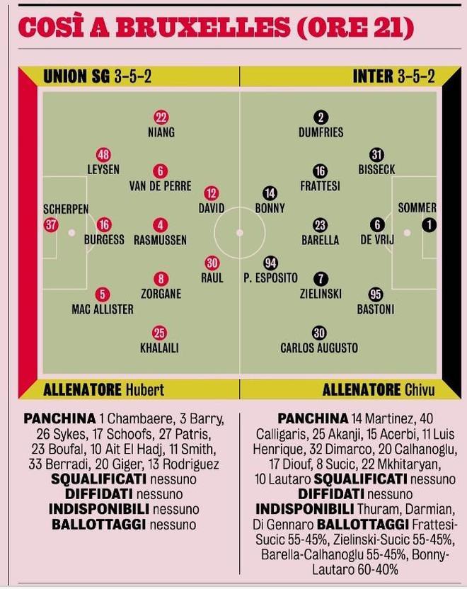 接下来聊一下明天凌晨的比赛,根据米体最新的阵容预测,索默将在这场比赛中进行大轮换。锋线上由皮奥和博尼联袂首发;中场巴雷拉出任后腰,泽林斯基和弗拉泰西分居左右,两翼则是奥古斯托和邓弗里斯;后防线从左往右依次是巴斯托尼、德弗里和比塞克,门将依旧是老将索默。